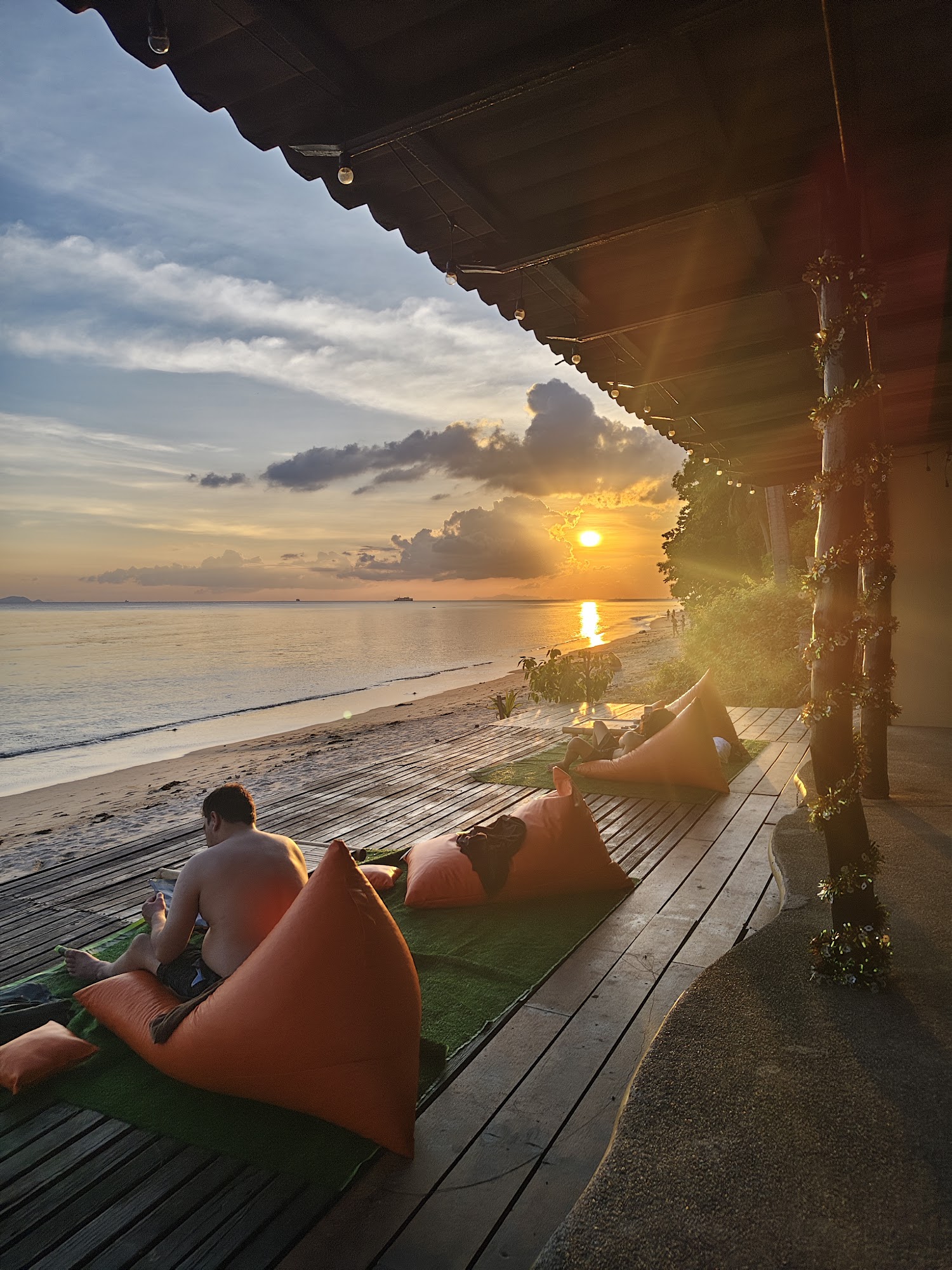 Our covered pavilion sits right by the water — no loud bar, just a calm vibe, the sound of the waves and conversations you'll only have on Koh Phangan.